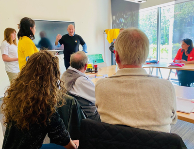 De studenten luisteren aandachtig naar Tim Cunningham, een van onze gastsprekers uit het werkveld. Hij sprak over live vertalen.
