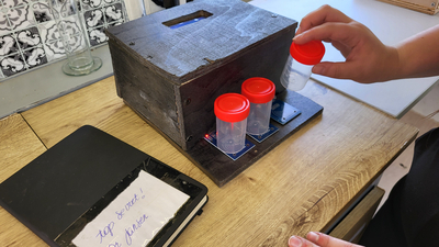 “Onze escaperoom is een spel waarbij een onderzoek van een prof belaagd wordt. De prof moet vluchten en de leerlingen moeten de onderzoeksresultaten redden,” legt Monas De Roeve uit. “Eerst moet de badge van de prof gezocht worden. Daarmee openen de leerlingen het labo en maken ze kennis met de uitdaging. Verderop in het game moeten de leerlingen onder meer drie potjes met schadelijke stoffen die aanwezig zijn in vapes, rangschikken op toxiciteit. Het notitieboekje van de prof kan hen daarbij helpen.”