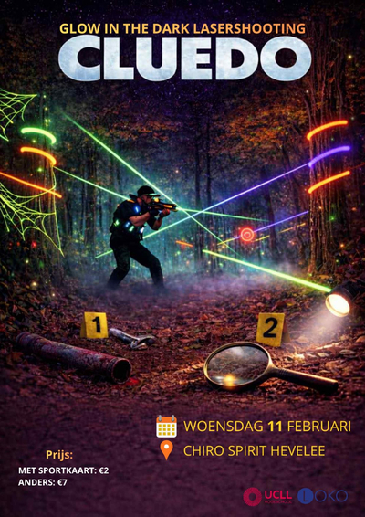 Ben jij klaar voor een avond vol actie, mysterie en gezelligheid ? Tijdens ons Glow in the Dark Lasershooting event toveren we het bos van Chiro Heverlee om tot een gigantisch Cluedo-bord. Samen met je team ga je de strijd aan tegen 3 andere groepen . Terwijl de laserstralen door het donkere bos schieten, is het aan jullie om de moordenaar te ontmaskeren. Zoek de tips die verspreid liggen tussen de bomen, werk samen en zorg dat jouw team de dader als eerste vindt! Hebben jullie de puzzel opgelost ? Dan is het tijd voor ontspanning. Warm lekker op met een tas warme chocomelk of geniet van een lekkere pannenkoek . Deelname kost slechts €2 als je een sportkaart hebt (zonder sportkaart betaal je €7). Zorg dat je ons volgt op Instagram (@glowinthedark_lasershootingwsf) zodat je geen enkele update over het event mist . Trommel je vrienden op en ontmasker de dader! Schrijf je snel in!