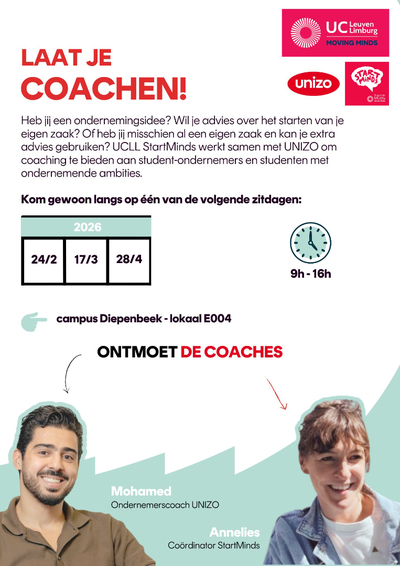 Vanaf dit academiejaar organiseert UCLL Startminds samen met een netwerk van partners, waaronder Unizo, twee keer per maand een zitdag voor student-ondernemers op de verschillende campussen. Student-ondernemers van UCLL krijgen gratis advies van diverse partners, gaande van je idee afstemmen tot financieel of strategisch advies.